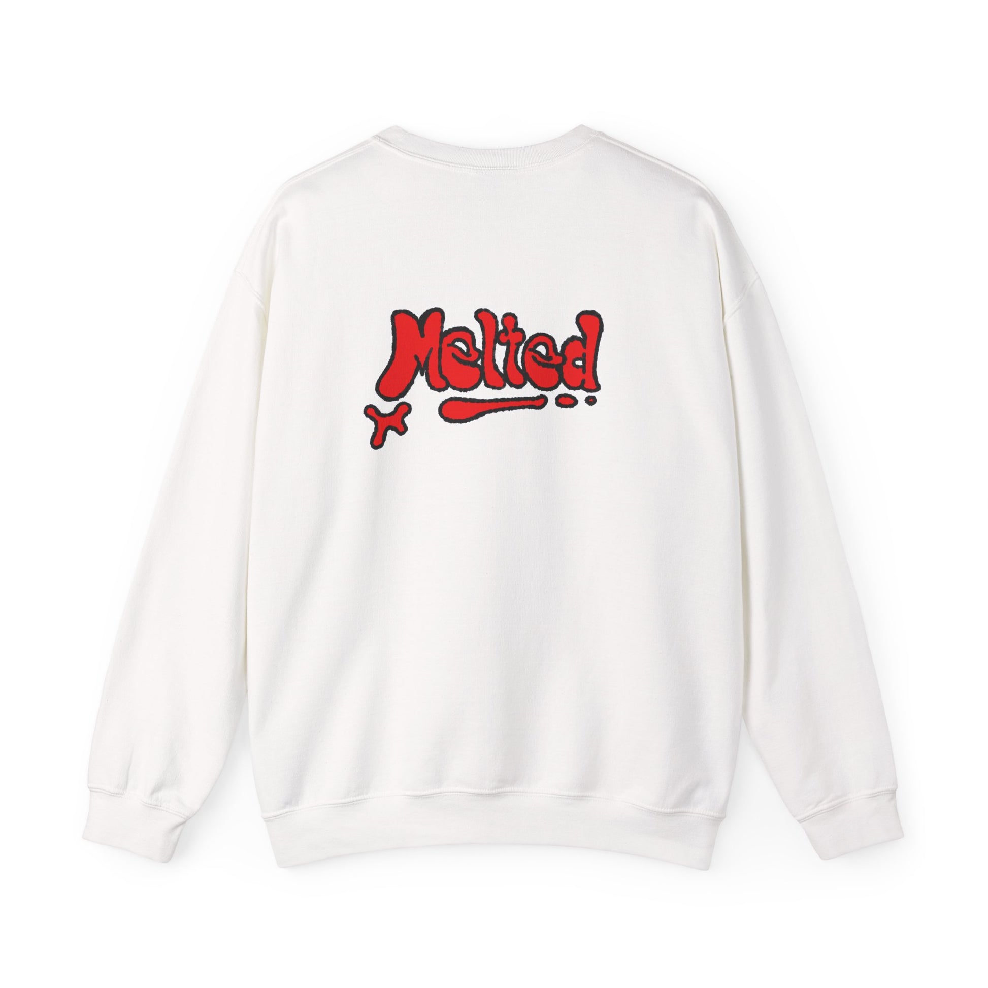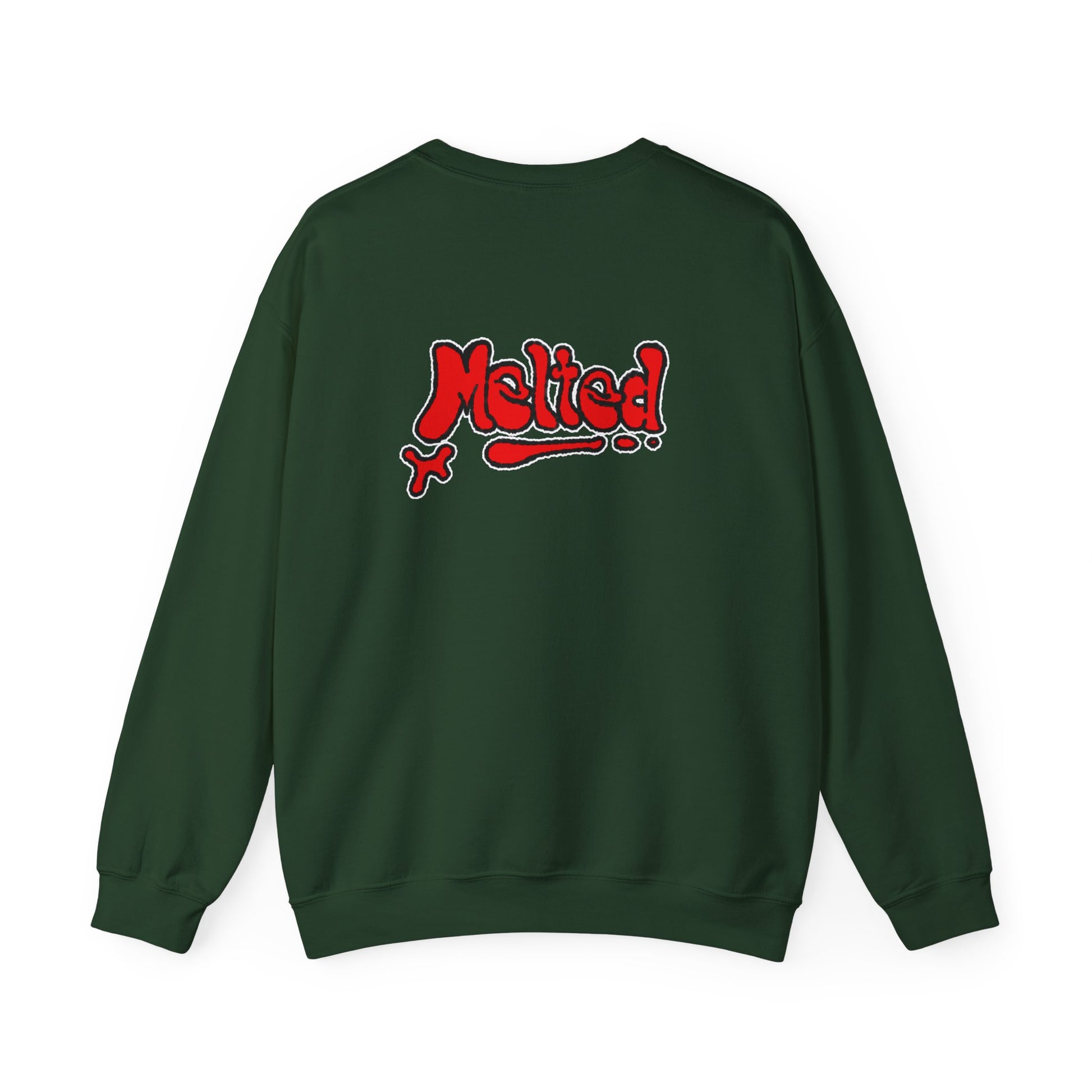 This crewneck sweatshirt feels like a quiet, confident shrug — warm, simple, and a little bit defiant. The soft, medium-heavy cotton-poly blend holds shape without feeling bulky. On the back, the bold, hand-drawn “Melted” graphic reads like a late-night doodle that stuck around — slightly nostalgic, a touch rebellious. Wear it on cool walks between shows, laid-back studio nights, or when you need a low-key layer that still says something.